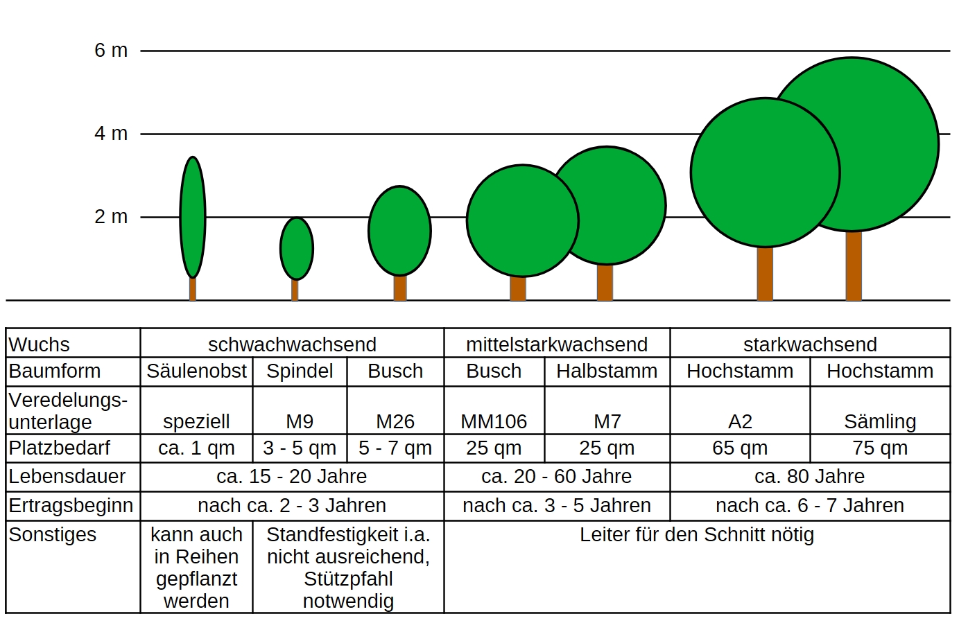 Hier die gängigen Formen am Beispiel des Apfelbaums, bei anderem Kernobst wie z.B. Birne und bei Steinobst (Pflaume, Kirsche usw.) gibt es Abweichungen